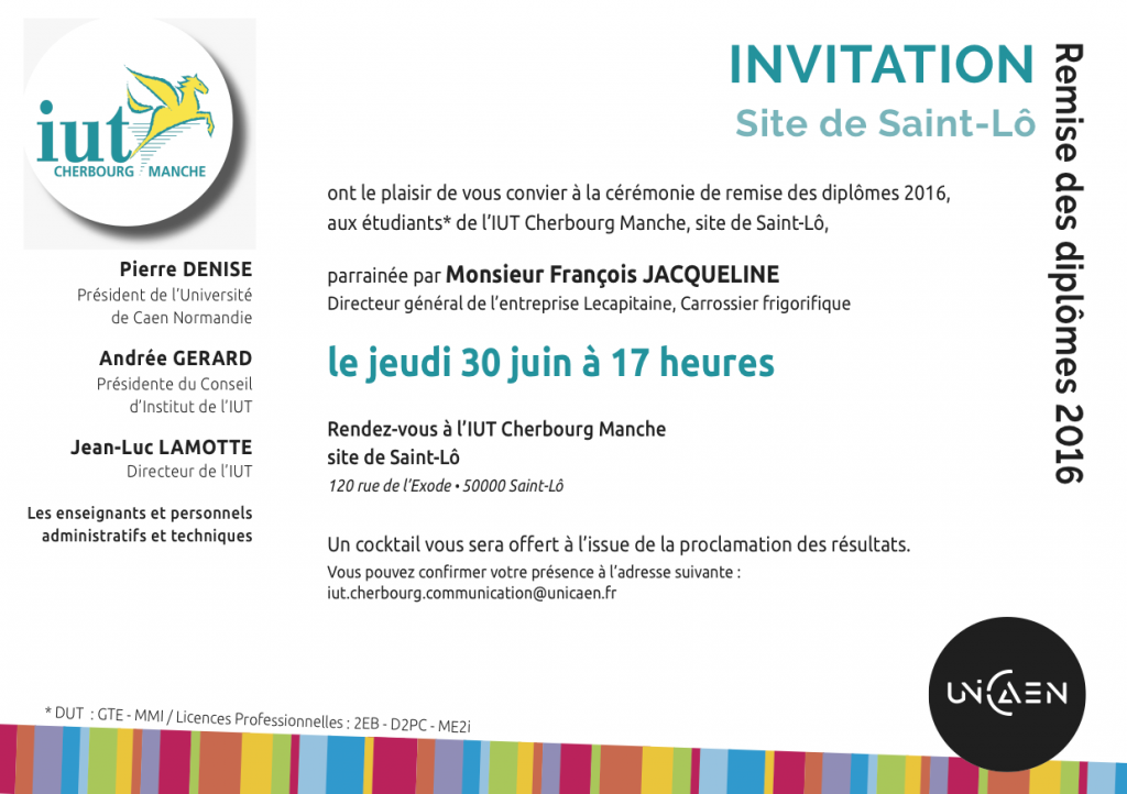 La remise des diplômes MMI 2016 aura lieu le 30 Juin 2016 à 17h00 dans l’amphithéâtre de l’IUT de Saint-Lô.